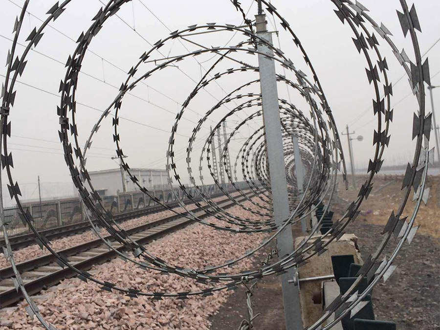 刺丝滚笼采用刀片刺绳绕圈后相临两圈每隔120°用刺丝连接卡固定,张开后形成蛇腹网状,闭合后刀片刺绳圈径为50cm,张开后每交叉圈安装间距20cm,直径不小于45cm。