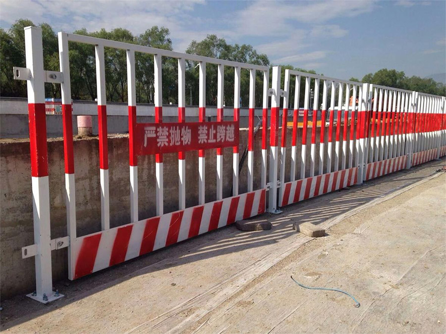 基坑护栏由防护网片和立柱组成。基坑围挡护栏防护网片由2cm×4cm方管焊接组成,单片尺寸1.1米×1.7米,两端设有跨耳用Φ10螺栓与立柱连接固定,跨耳与上下边缘距离为15cm。